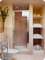 Големината на бањата ги одредува бројот на санитарните уреди, како и нивните димензии. Доколку имате мала бања, тогаш препорачливо е да имате туш кабина со стаклена врата, која создава илузија на поголем простор. Исто така за овие бањи препорачливи се шољи со мали димензии. За подобар визуелен ефект на бањата, препорачливо е шољата да не биде поставена веднаш пред вратата на бањата. Во однос на боите, добар избор се посветлите и потопли бои кои дополнително ќе направат бањата да изгледа поголема. | ![]() |