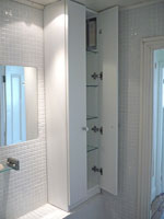 Доколку сакате во бањата да поставите полици за крпите, средствата за хигиена, средства за чистење или пак декоративни елементи, препорачливо е тие да бидат поставени поблиску до таванот за да максимално искористување на просторот. Освен тоа со поставување на фиоки и ормарчиња во бањата се добива повеќе простор и се намалува нередот.